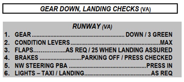 Les types de listes de vérification CR, RD et SD sont décrits en détail dans les procédures d’exploitation normalisées (SOP) OMNRF CL-415 SOP—CL-415 Standard Operating Procedures et sont accompagnés d’exemples précis du rôle de chaque membre d’équipage lors de l’exécution de ces listes de vérificationNote de bas de page 11 Toutefois, les SOP ne renvoient pas à la liste de vérification OMNRF CL-415 Checklist de manière spécifique. Bien qu’il n’existe pas de description similaire pour le type de liste de vérification VANote de bas de page 12, les actions vitales sont décrites dans les SOP comme étant [traduction] : « [d]es vérifications et exercices à mémoriserNote de bas de page 13. » La liste de vérification GEAR DOWN, LANDING CHECKS (figure 2) est qualifiée de liste de vérification d’actions vitales.