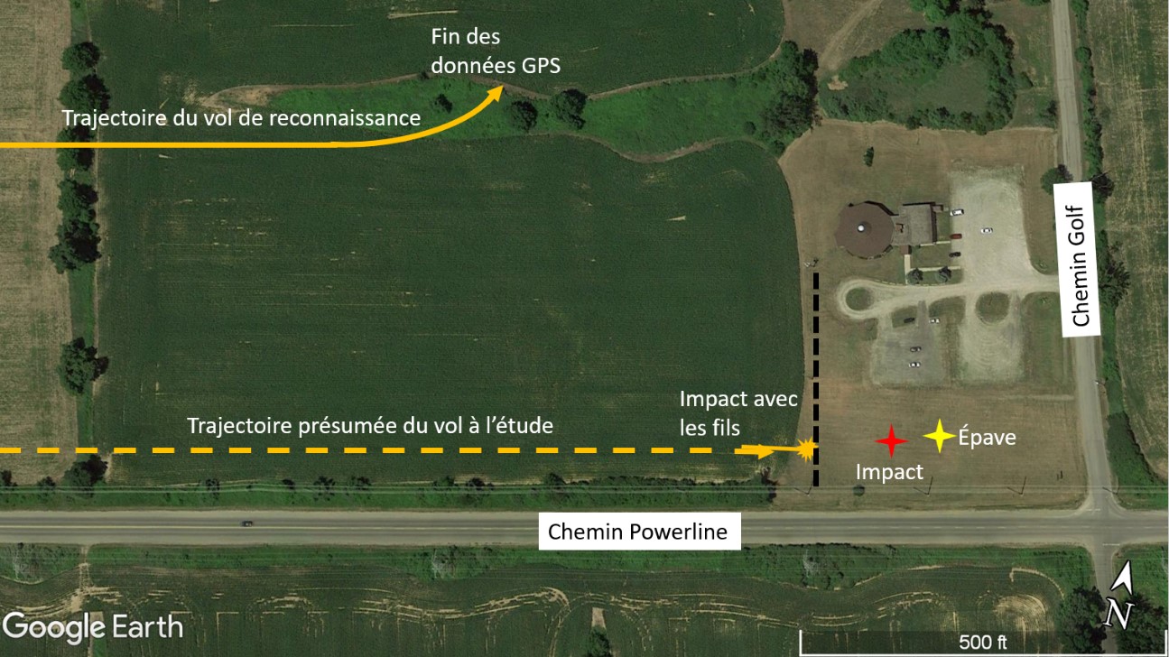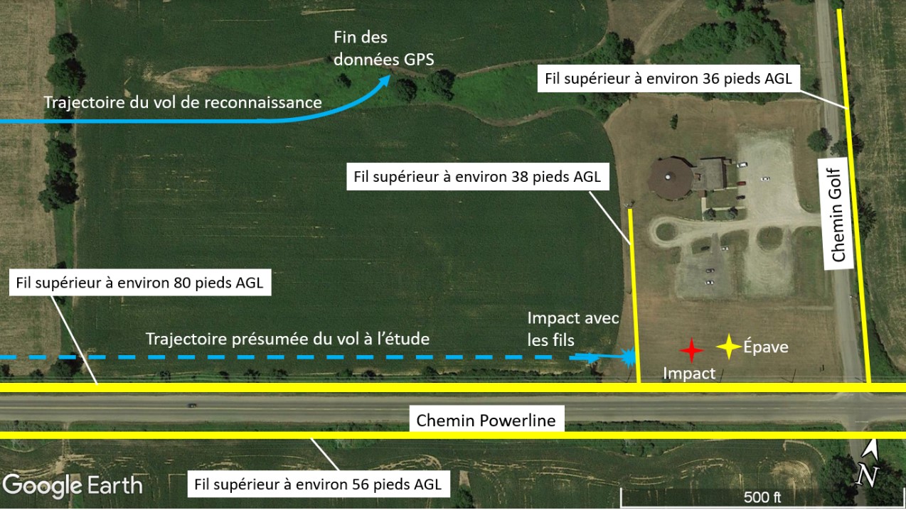 L’impact avec les fils s’est produit près de l’intersection des chemins Powerline et Golf, à la limite entre le champ de maïs et le terrain d’une église situé sur le chemin Golf. Les fils étaient parallèles à la trajectoire de vol à l’étude, de chaque côté du chemin Powerline, à des hauteurs allant jusqu’à 80 pieds AGL. Il y avait également des fils le long du chemin Golf, à 1000 pieds à l’est du lieu de l’événement; ceux-ci se trouvaient jusqu’à 36 pieds AGL et étaient parallèles aux fils qui ont été heurtés (figure 5).