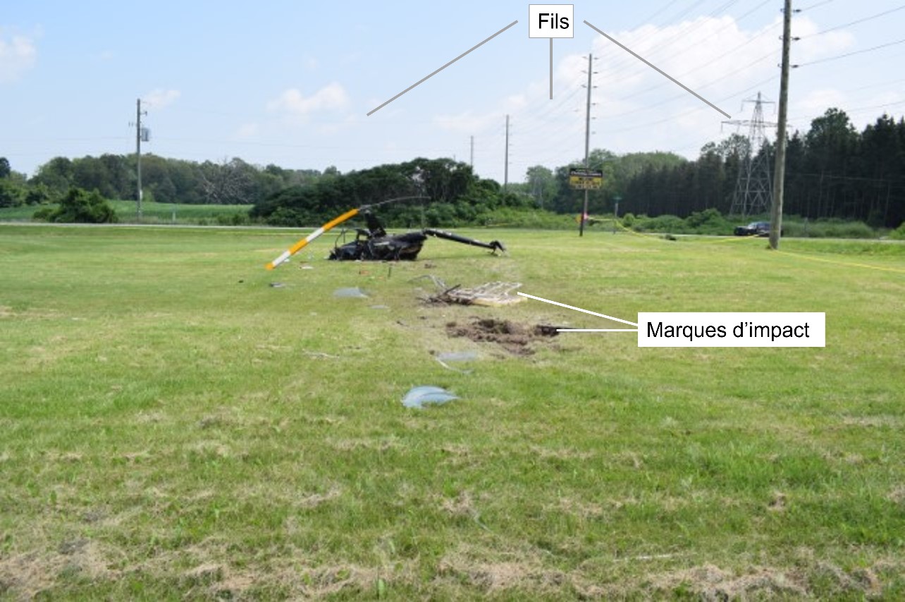 L’hélicoptère a vraisemblablement volé parallèlement à l’extrémité sud du champ, sur un cap d’environ 077° magnétique (M). À 6 h 59 min 44 s, il a heurté des fils à une hauteur d’environ 30 pieds AGL. La maîtrise de l’hélicoptère a été perdue, et l’hélicoptère est entré en collision avec le sol avant de s’immobiliser dans un champ gazonné à environ 270 pieds au-delà du lieu de l’impact avec les fils.