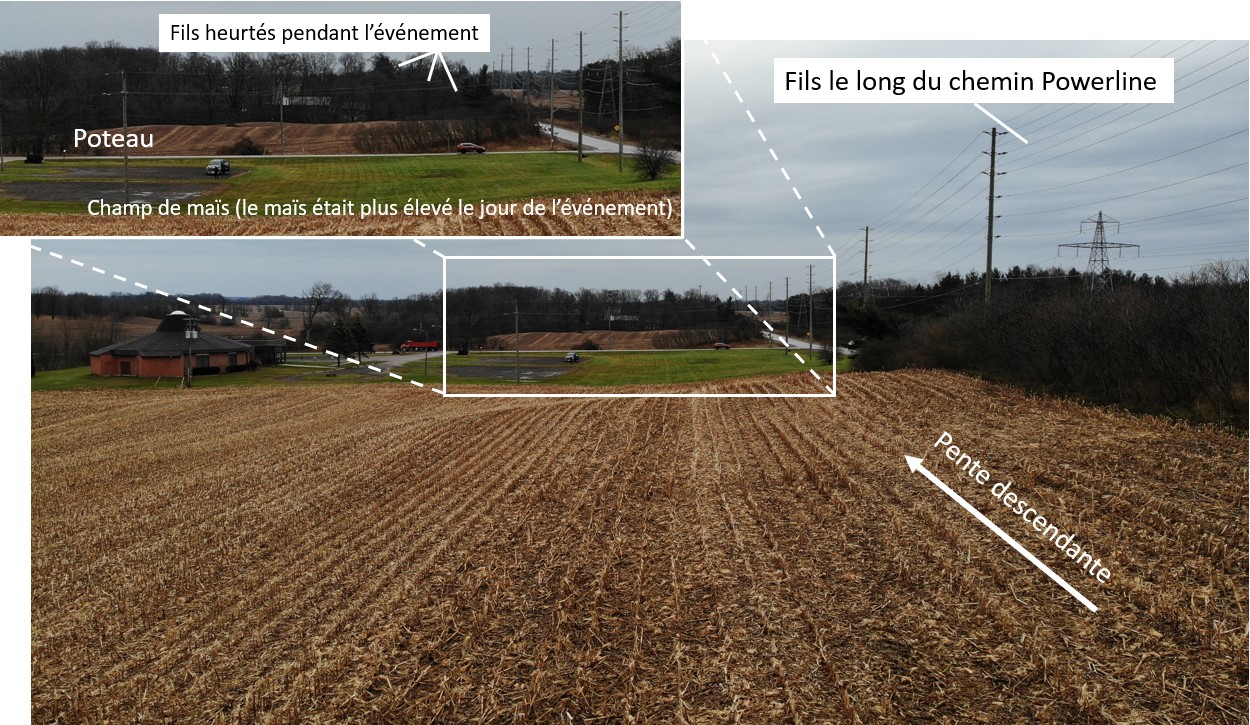 Les fils qui ont été heurtés étaient nettement moins visibles. Au lieu de longer une route ou l’allée de l’église, ils longeaient la bordure d’un champ de maïs, ce qui n’est pas l’endroit où les pilotes s’attendent à les voir, ni celui où ils se concentrent pour détecter les dangers. Ces fils étaient plus bas que les 2 ensembles de fils bien visibles allant d’est en ouest, et les bases de leurs poteaux associés étaient obscurcies par le maïs. Par conséquent, ils étaient plus difficiles à détecter en vol, surtout lorsqu’ils étaient vus de l’ouest.