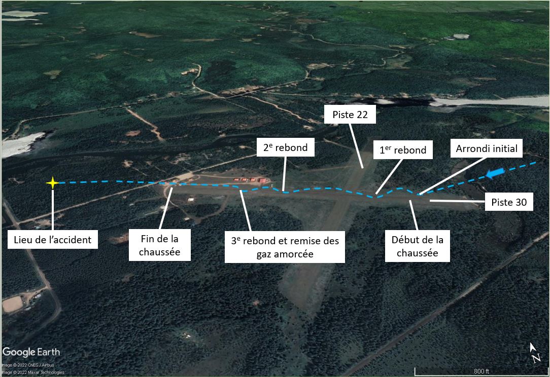 Au cours du 2e rebond, l’aéronef a atterri sur sa roue avant et un brouettage s’est produit momentanément avant que l’aéronef reprenne son envol. Selon les renseignements recueillis, l’aéronef se serait élevé d’environ 15 pieds dans les airs au cours du 3e rebond et aurait perdu une grande partie de sa vitesse et de son élan. À ce moment, il restait environ 700 pieds de piste.