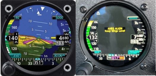 Le pilote a alors demandé une légère déviation de la route de vol pour éviter d’entrer dans les nuages. Toutefois, au cours de cette déviation, les nuages n’ont pas pu être évités, et l’aéronef est entré dans des conditions météorologiques de vol aux instruments (IMC). Peu après, l’indicateur d’assiette (ADI)Note de bas de page 3 de l’aéronef a affiché le message « AHRS ALIGN » (alignement du système de référence de cap et d’assiette), et les indications d’assiette (tangage et inclinaison) ont été perdues, tandis que les indications de vitesse anémométrique, d’altitude et de vitesse verticale ont été conservées (figure 1).