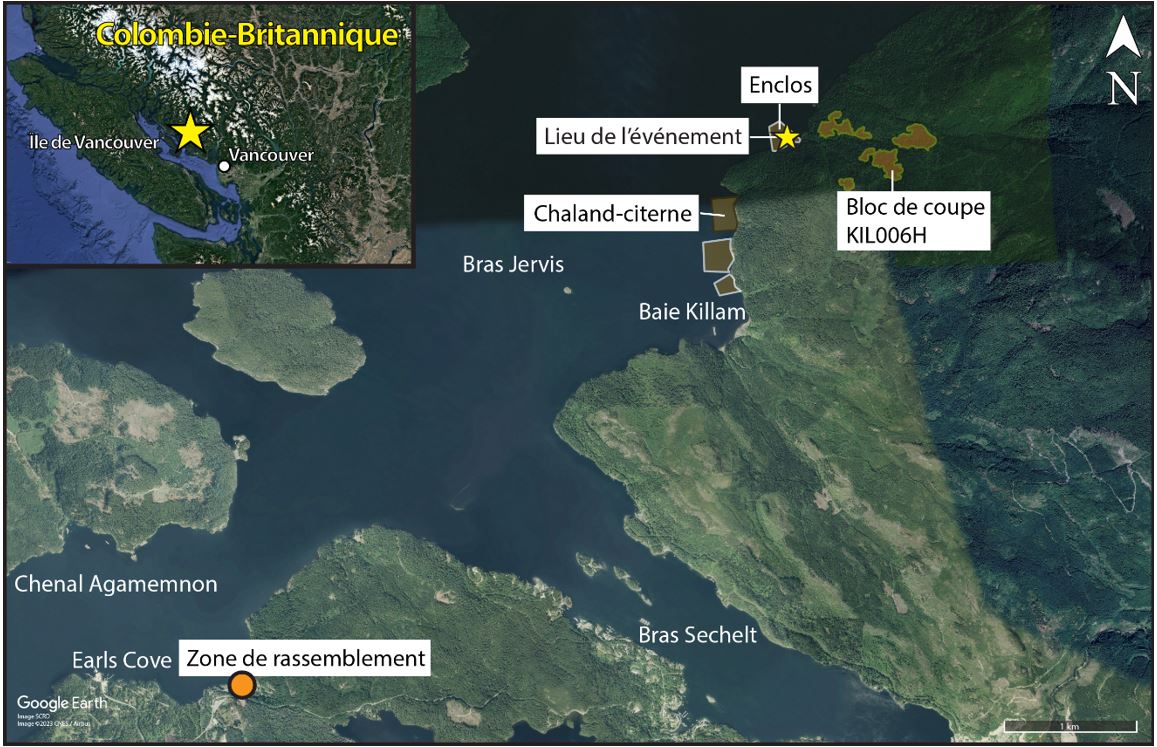 Le 4 octobre 2021, l’hélicoptère Kaman Aerospace Corporation K-1200 exploité par Black Tusk Helicopter Incorporated (Black Tusk) effectuait des opérations de débusquage par hélicoptère dans les environs de la baie Killam, dans le bras Jervis (Colombie-Britannique). La zone de rassemblement des hélicoptères se trouvait à Agamemnon Bay (Colombie-Britannique), à environ 0,5 mille marin (NM) à l’est d’Earls Cove (Colombie-Britannique) et à environ 4 NM au sud-ouest des blocs de coupe. Black Tusk disposait également d’un chaland-citerne sans équipage amarré le long de la rive ouest de Killam Bay et en aval des blocs de coupe. Elle offrait une zone d’atterrissage à proximité en cas d’urgence et stockait du carburant aviation pour ravitailler l’hélicoptère pendant les opérations forestières quotidiennes (figure 1).