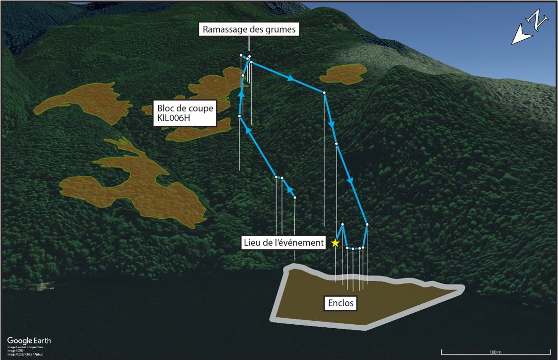 Environ 49 minutes plus tard, l’aéronef a quitté le chaland et a effectué 4 tours de l’enclos au bloc de coupe KIL006H, situé à 0,6 NM au sud-est. Au 5e tour, l’aéronef a quitté le bloc de coupe avec un chargement de 3 grumes dans la pince de débardage à 13 h 2 min 19 s Environ 75 secondes plus tard, l'aéronef a largué les grumes dans l’enclos, a amorcé un virage lent de 180° et a entamé une montée pour retourner au bloc de coupe. À 13 h 3 min 42 s, à la suite d’une transmission radio de routine au gestionnaire de l’exploitation forestière, l’aéronef a entamé une descente rapide. Environ 4 secondes plus tard, il a percuté l’eau dans l’enclos et a coulé (figure 2).