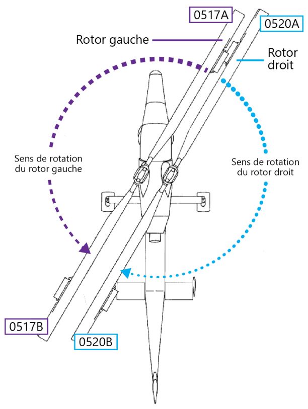 Les 2 ensembles rotor ont chacun 2 pales de rotor qui sont appariées par l’avionneur. Les paires de pales de l’hélicoptère à l’étude étaient les suivantes : les pales portant les numéros de série 0517A et 0517B étaient installées sur le moyeu du rotor de gauche, tandis que les pales portant les numéros de série 0520A et 0520B étaient installées sur le moyeu du rotor de droite.