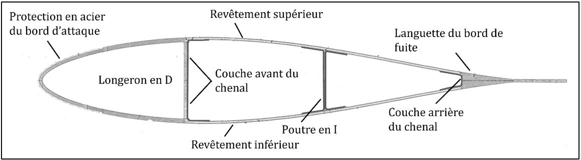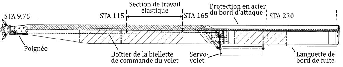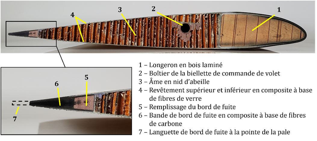 Chaque pale de rotor principal a une surface portante monocoque à profil cambré où le revêtement de la pale est un élément essentiel de la conception structurelle et supporte une part importante de l’effort de torsion pendant le fonctionnement de la pale. Chaque pale de rotor est constituée d’un longeron en épinette de Sitka laminé, d’une âme en nid d’abeille et d’un bord de fuite en fibres de carbone, et elle est enveloppée d’un revêtement en composite à base de fibres de verre (figure 5). La largeur du longeron en bois varie tout au long de la pale. À partir du servo-volet vers le bout de la pale, les revêtements supérieurs et inférieurs se prolongent au-delà du bord de fuite pour former une languette de bord de fuite.