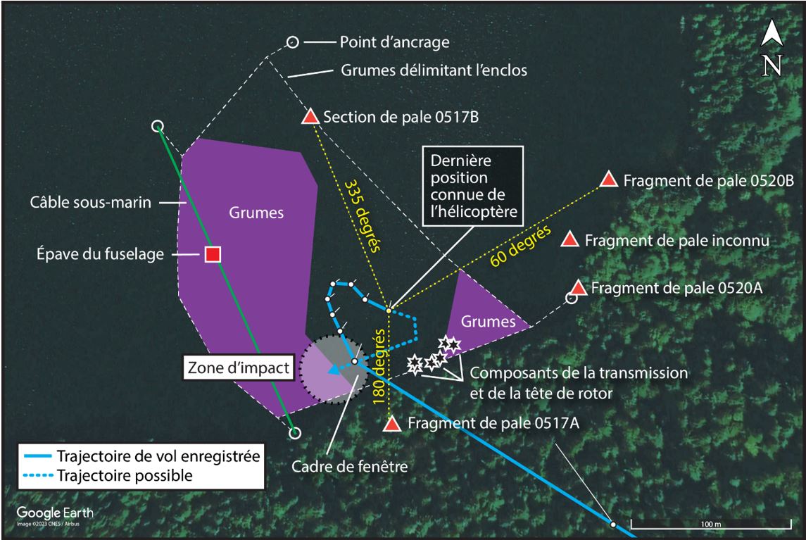 Les débris des pales de rotor principal ont été trouvés éparpillés à une distance considérable de la dernière position en vol connue de l’hélicoptère et du point d’impact probable. Une grande section de la pale de rotor principal 0517B et la pointe de la pale de rotor principal 0517A ont été trouvées dans des positions fixes, en des sens presque opposés et à 750 pieds l’une de l’autre, tandis que plusieurs fragments de pale de rotor ont été trouvés flottant à l’extérieur de l’enclos. Compte tenu de l’attitude en piqué de l’hélicoptère au moment de l’impact, il a été déterminé que la répartition radiale des pales de rotor n’était possible que si l’aéronef avait eu une trajectoire de vol relativement horizontale au-dessus de la surface de l’eau au moment de l’événement.