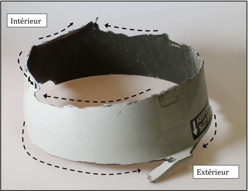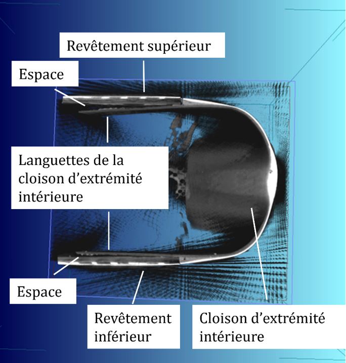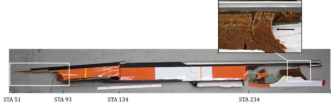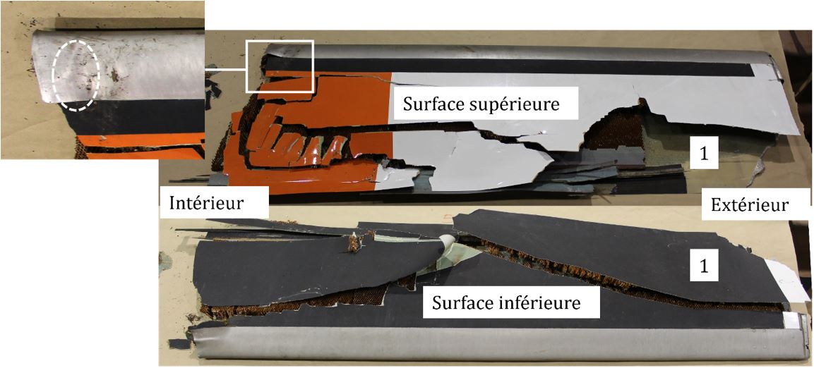 Les servo-volets sont fabriqués en matériaux composites dont l’intégrité structurale critique repose en grande partie sur la force du collage par produit adhésif. Cependant, l’examen des 3 volets récupérés a révélé les lacunes suivantes dans les zones de collage entre la cloison d’extrémité intérieure et le servo-volet :