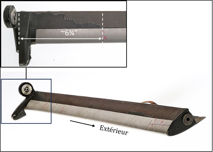 Le servo-volet de la pale 0517B avait également subi des dommages en raison des vibrations aéroélastiques, comme l’indiquent la déchirure bidirectionnelle des revêtements et le fait que la tête du boulon de la biellette de commande avait touché le support intérieur. Toutefois, ces dommages ne s’étaient produits que dans la zone III de la défaillance, lorsque la longueur de la rupture du revêtement supérieur intérieur a atteint 16 ½ pouces, soit 47 % de la largeur totale du volet, qui est de 35 pouces. Par conséquent, il a été déterminé que les vibrations aéroélastiques du servo-volet de la pale 0517B ne s’étaient produites qu’après que sa structure dans la partie intérieure (zones I et II) eut subi des dommages importants.