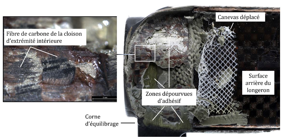 Le servo-volet de la pale 0517B été examinée au SEM. La région des ruptures initiales du revêtement supérieur à l’extrémité intérieure présentait un frottement important des surfaces de rupture des couches ainsi que des signes de rupture par fatigue dans la couche du profilé en C avant, ce qui indique que le revêtement était fissuré avant la défaillance catastrophique du système de rotor principal dans l’événement à l’étude. De plus, l’érosion des extrémités des fibres du revêtement inférieur et le dépôt d’un corps étranger indiquent qu’un joint de collage rompu entre la cloison d’extrémité intérieure et le servo-volet a exposé la partie intérieure à l’environnement avant l’événement. Par conséquent, il est probable que la rupture des joints de collage entre la cloison d’extrémité intérieure et le servo-volet a été l’événement déclencheur conduisant à la fissuration des revêtements des servo-volets.