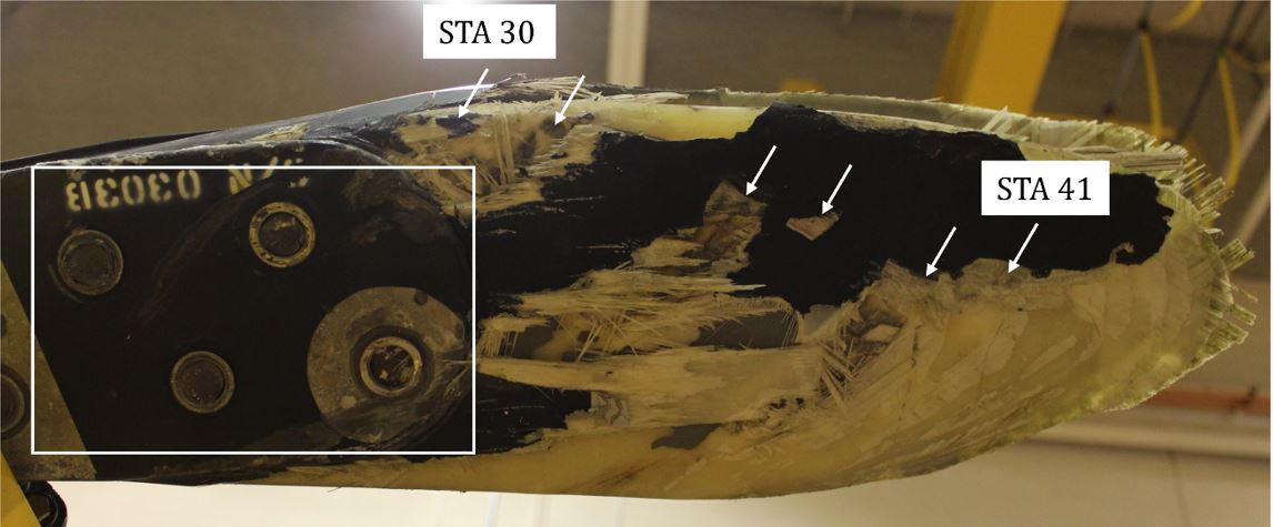 À l’inverse, le bord de fuite de la pointe de la 4e pale du rotor, 0517B, était intact et n’a pas subi de dommages dus aux vibrations aéroélastiques. Toutefois, le corps de la pointe de la pale s’est rompu sous l’effet de l’impact vertical avec le périmètre de l’enclos, comme l’indique la compression de l’âme en nid d’abeilles dans le sens longitudinal intérieur. Ainsi, pendant les vibrations en vol et le déséquilibre du rotor, la pale 0517B n’a pas été soumise aux charges aérodynamiques de torsion exercées par la position du servo-volet lorsque le volet est devenu inefficace en raison de la séparation du corps arrière du volet. La pale du rotor était neutre sur le plan aérodynamique et produisait beaucoup moins de portance.