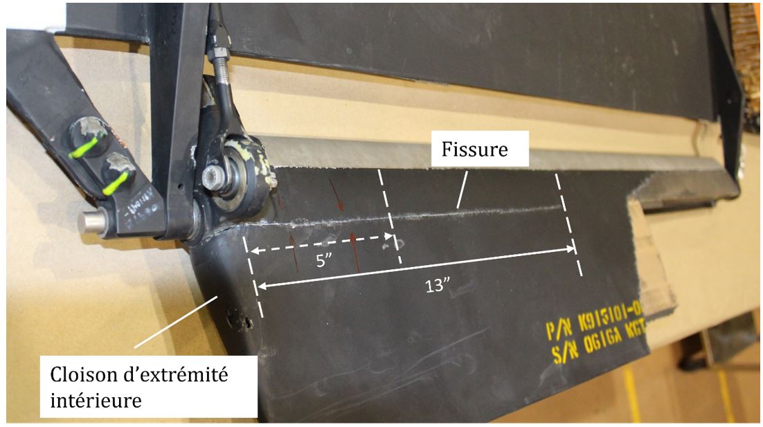 L'essai d’évaluation de la fatigue d’une partie du servo-volet consistait à évaluer la propagation d’une fissure induite artificiellement et d’une fissure induite par surcharge dans la jonction entre le longeron et le corps arrière du volet. Il a été conclu que [traduction] « le volet est résistant à la propagation de fissures et qu’il n’est probablement pas la cause de la défaillance »Ibid..