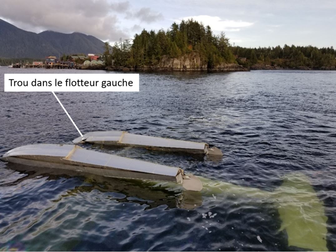Immédiatement après la collision, le pilote a effectué les vérifications après amerrissage et a coupé le moteur. Le flotteur gauche de l’aéronef a été endommagé lors de la collision et a commencé à se remplir d’eau. Le pilote a ordonné aux passagers de sortir de l’aéronef. Environ 40 secondes après la collision, alors que le pilote et les passagers commençaient l’évacuation, l’aéronef a commencé à s’incliner vers la gauche et vers l’avant, puis s’est immobilisé brièvement en position verticale, le nez dans l’eau et la queue droit dans les airs.