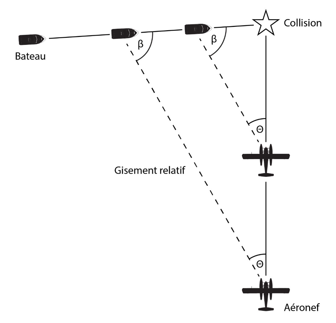 Les différences physiologiques entre les visions fovéale et périphérique influent sur la perception des objets se déplaçant vers une personne. Les personnes sont sensibles au mouvement dans leur vision périphérique; cependant, cette sensibilité diminue lorsque les objets sont stationnaires dans le champ de vision. Si une cible converge au même point que la personne qui regarde, le gisement relatif restera constant et il est probable que la cible ne sera pas remarquée, car sa position sur la rétine semble stationnaire (figure 7). En outre, bien que les systèmes de vision fovéale et périphérique puissent détecter le mouvement, le système fovéal réussit mieux à détecter les mouvements lents, tandis que le système périphérique est meilleur pour détecter les mouvements rapidesNote de bas de page 17.