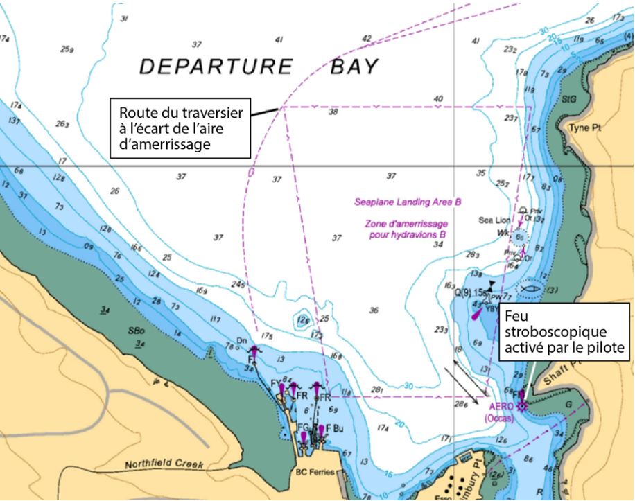 L’information sur les aires d’amerrissage désignées est mise à la disposition des conducteurs de navires dans les cartes marines et les instructions nautiques. À titre d’exemple, la figure 10 montre la carte marine du port de Nanaimo, qui comporte à la fois une aire d’amerrissage désignée et un feu activé par le pilote. Il n’y a pas d’aire d’amerrissage désignée pour les hydravions à Tofino.