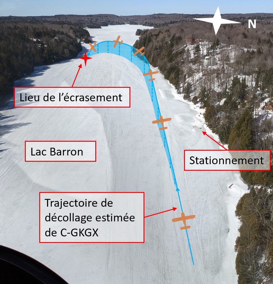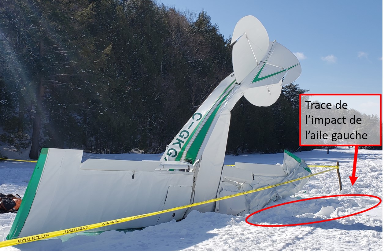 Lors du décollage en direction ouest sur la surface gelée du lac, les volets étaient réglés à 40°Note de bas de page 2. L’aéronef est monté à près de 50 pieds au-dessus du sol (AGL) près de la rive nord du lac et a amorcé un virage à gauche avec les volets toujours réglés à 40°Note de bas de page 3. L’aéronef est entré en vrille vers la gauche et a percuté la surface du lac pratiquement à la verticale, l’aile gauche touchant la surface en premier (figure 1)Note de bas de page 4.