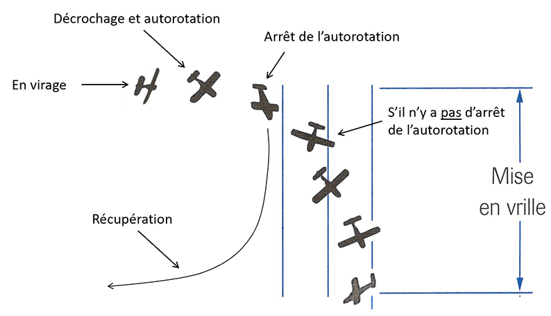 La vitesse de décrochage, quant à elle, varie entre autres selon le poids de l’aéronef, le réglage de la puissance, la position des volets et l'angle d'inclinaison de l’aéronef. La mise en vrille s'amorce au moment où l’aéronef décroche et qu'une aile produit plus de portance que l'autre. L'aile descendante ayant un angle d'attaque plus grand décroche encore plus et produit plus de traînée, ce qui provoque une autorotation. Pendant cette phase de mise en vrille, la trajectoire de vol passe de l'horizontale à la verticaleNote de bas de page 7.