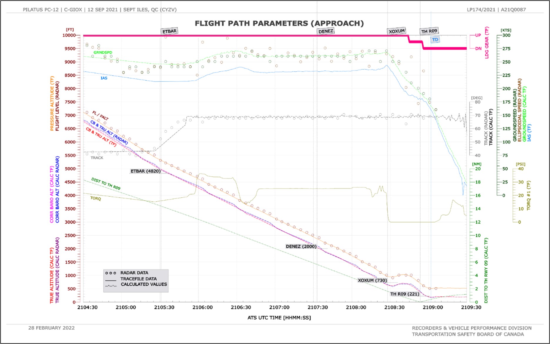 À 17 h 05, l’avion a franchi le point de cheminement d'approche initiale ETBAR à 5078 pieds au-dessus du niveau de la mer (ASL), soit environ 250 pieds au-dessus de la pente d’approche de 3°, à une vitesse de 213 KIAS. L’équipage avait la piste 09 en vue, et le commandant a pris la décision d’accélérer pour effectuer une approche finale à haute vitesse, avec une décélération juste avant la piste. Croyant à tort que la limite de vitesse de 210 nœuds publiée sur la carte d’approche aux points de cheminement IGSUK et VOKON s’appliquait également à l’approche directe via ETBAR, le commandant a demandé au P/O d’annuler le plan de vol selon les règles de vol aux instruments (IFR) pour continuer l’approche selon les règles de vol à vue (VFR) et donc sans limitation de vitesse.
