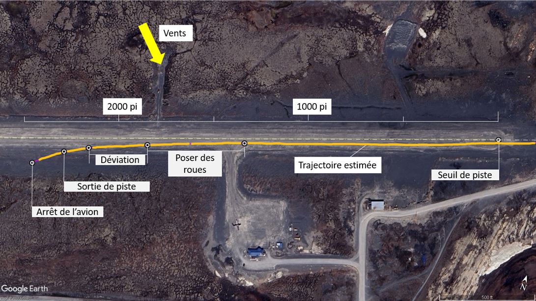 L’aéronef s’est posé sur la piste 27 à 6 h 32. Peu après le poser des roues, l’aéronef a commencé à dévier vers la gauche. Le PIC a tenté de maintenir la trajectoire de l’aéronef en ligne droite en vain. Il a amorcé une remise des gaz, mais l’aéronef a fait une sortie de piste, et le train d’atterrissage de gauche a percuté un banc de neige en bordure de piste immédiatement après. Dès que l’aéronef s’est immobilisé au sud de la piste, le PIC a ordonné l’évacuation. La radiobalise de repérage d’urgence (ELT) s’est déclenchée, et le signal de détresse a été capté à 6 h 33 par le Centre canadien de contrôle des missions de Trenton (Ontario).