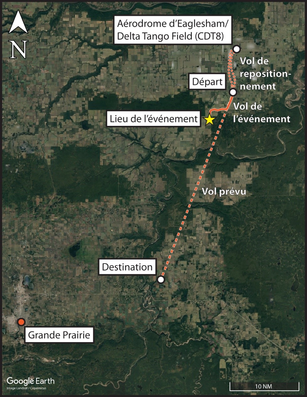 Vers 19 h 20, pendant les heures d’obscurité, le pilote a sorti l’hélicoptère du hangar chauffé et a effectué l’inspection prévol. Ensuite, le pilote accompagné de 2 passagers adultes sont partis pour un court vol VFR de nuit local afin de repositionner l’hélicoptère vers la ferme familiale. L’aéronef a volé sur une distance de 6 NM vers le nord, jusqu’à l’aérodrome d’Eaglesham/Delta Tango Field (CDT8) (Alberta), avant de retourner à la ferme où la famille du pilote l’attendait (figure 1).