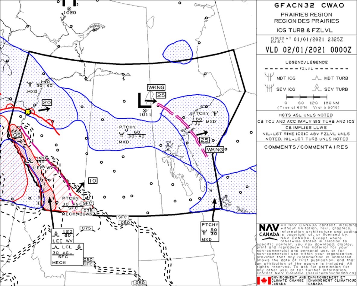 La prévision de zone graphique (GFA) pour la région des Prairies a été émise le 1er janvier 2021 à 16 h 25 et était valide de 17 h à 5 h (le 2 janvier 2021) (annexe A). Selon cette GFA, il était prévu que les régions de Grand Prairie et de Peace River seraient sous l’influence d’un front chaud en altitude qui se déplaçait vers le nord-est à 20 nœuds. Les conditions météorologiques à l’avant (à l’est) du front comportaient des bases de nuages entre 3000 et 4000 pieds ASL avec des sommets à 22 000 pieds ASL, ce qui se traduisait par des visibilités de 1 à 3 SM dans des averses de neige légères avec des visibilités occasionnelles de ½ SM dans des averses de neige avec des plafonds nuageux épars de 800 à 1500 pieds AGL. Derrière le front chaud supérieur (à l’ouest de celui-ci), des nuages épars avec des bases à 4000 pieds ASL et des sommets à 6000 pieds ASL étaient prévus.