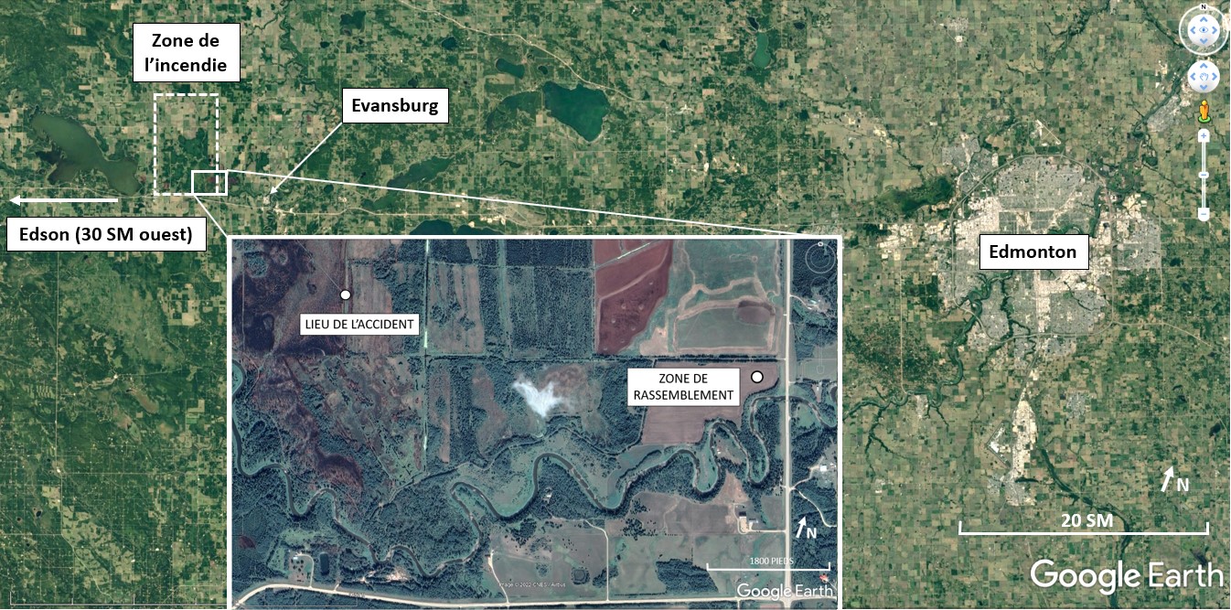Vers 10 hNote de bas de page 1 le 28 juin 2021, l’hélicoptère Bell Textron Inc. (Bell) exploité par Yellowhead Helicopters Ltd. (Yellowhead Helicopters), de modèle 212 (immatriculation C‑GYHQ, numéro de série 30933), a décollé de l’aéroport d’Edson (CYET) (Alberta) pour appuyer les activités de lutte contre l’incendie de forêt EWF-075, situé à 4 milles marins (NM) à l’ouest-nord-ouest d’Evansburg (Alberta). L’hélicoptère est arrivé sur les lieux vers 10 h 25 pour commencer les opérations de soutien par réservoir héliporté. Ces opérations ont pris fin vers 12 h 46, et le pilote est retourné à la zone de rassemblement pour attendre qu’on lui attribue sa prochaine tâche (figure 1).