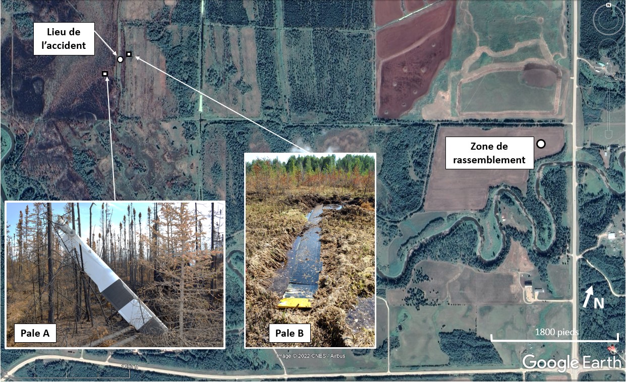 Le 28 juin 2021, l’hélicoptère Bell Textron Inc. de modèle 212 exploité par Yellowhead Helicopters Ltd. (immatriculation C-GYHQ, numéro de série 30933) effectuait des opérations en soutien à des activités de lutte contre un incendie de forêt à environ 4 milles marins à l’ouest-nord-ouest d’Evansburg (Alberta). Vers 18 h, heure avancée des Rocheuses, l’hélicoptère a quitté la zone de rassemblement pour effectuer une série de 3 vols visant à transporter des groupes de pompiers forestiers vers la zone de rassemblement. Les 2 premiers voyages se sont déroulés sans incident. Au cours du dernier voyage, alors que l’hélicoptère s’approchait de la zone d’atterrissage pour embarquer le dernier groupe de pompiers, l’une des pales du rotor principal s’est séparée de l’ensemble de tête de rotor. La 2e pale de rotor et l’ensemble de tête de rotor se sont alors détachés de l’hélicoptère, et celui-ci s’est écrasé. Le pilote, seul occupant à bord, a été mortellement blessé. Un incendie s’est déclaré après l’impact et a détruit l’hélicoptère. Aucun signal de la radiobalise de repérage d’urgence de 406 MHz n’a été reçu.