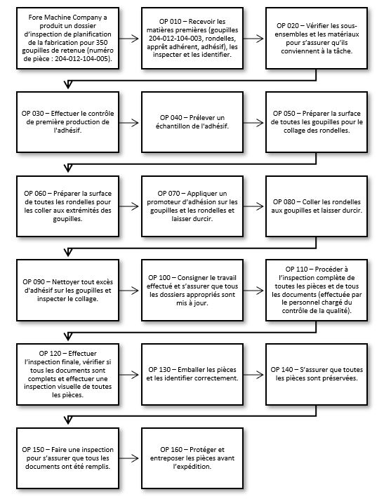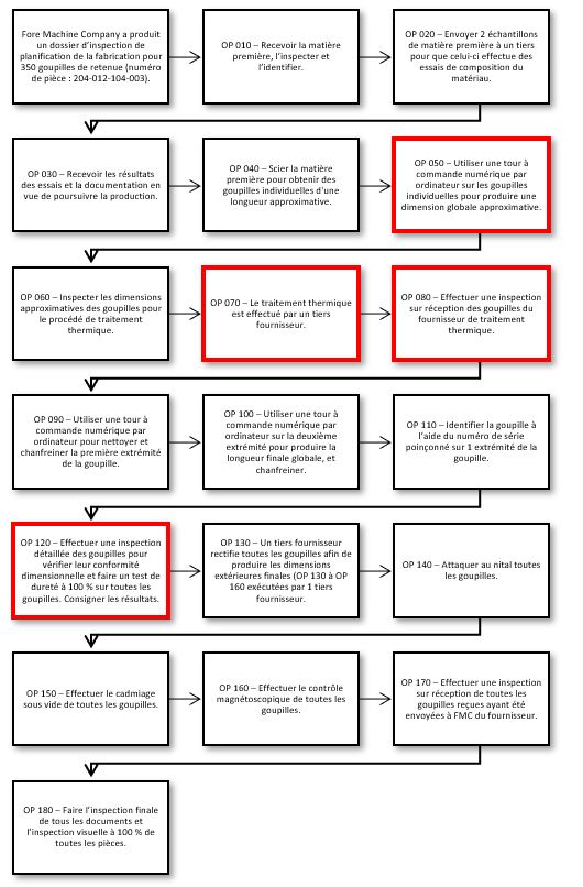 - Pour des raisons indéterminées, l’inspecteur au contrôle de la qualité à Fore Machine Company n’a pas observé, que ce soit par une inspection visuelle ou par un examen de la documentation de certification, que des matériaux mixtes avaient été identifiés dans le lot. Par conséquent, les goupilles fabriquées à partir de la mauvaise spécification de matériaux sont passées aux prochaines étapes du processus de production.