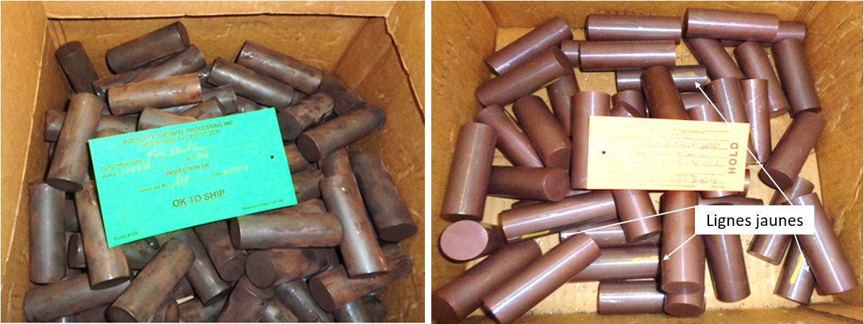 Une partie normale du processus d’inspection sur réception est une inspection visuelle des pièces reçues. Comme le montre la figure 10, il y a une nette différence dans l’aspect visuel des ébauches de goupilles brutes (entre l’acier à outils H11 et l’acier inoxydable 316) retournées par le fournisseur de traitement thermique. En outre, les goupilles qui ne répondaient pas à la spécification de dureté étaient identifiées par une ligne jaune marquée le long de la goupille.