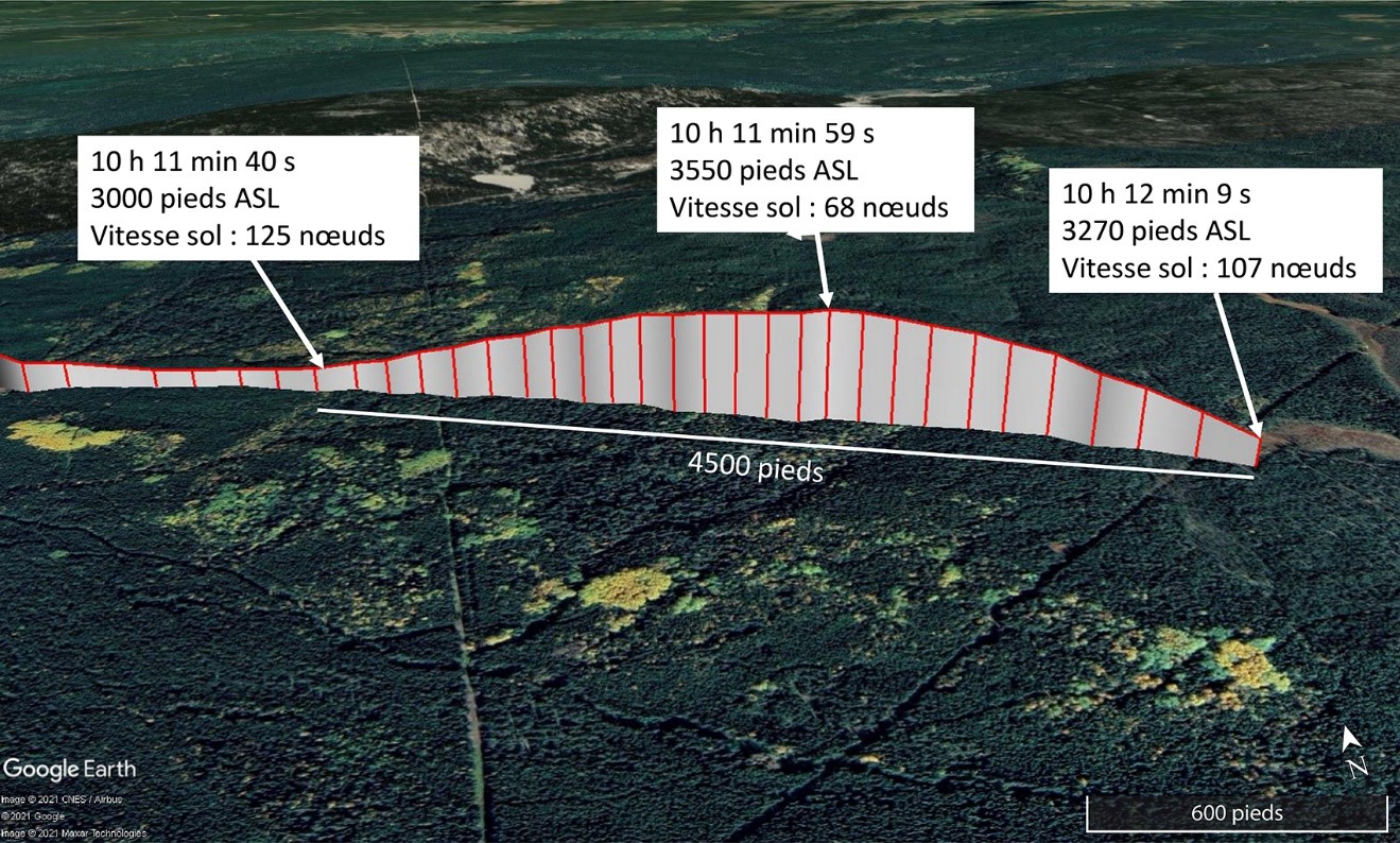 À 10 h 11 min 40 s, l’aéronef est monté à 3550 pieds ASL, et sa vitesse sol a diminué pour passer de 125 nœuds à 68 nœuds. L’aéronef a ensuite amorcé une descente à 10 h 11 min 59 s, et il a poursuivi celle-ci jusqu’à peu après 10 h 12 min 9 s, lorsqu’il a percuté le relief dans une zone boisée à environ 3200 pieds ASL (figure 3). Les données GPS extraites du système numérique de surveillance de moteurNote de bas de page 2 ont indiqué que l’angle de descente de l’aéronef était d’environ 15° avant de heurter les arbres. Le taux de descente moyen était de 1680 pi/min jusqu’à quelques secondes avant l’impact, puis il a augmenté à plus de 2000 pi/min. Le pilote a été mortellement blessé. L’aéronef a été détruit. La radiobalise de repérage d’urgence s’est déclenchée.