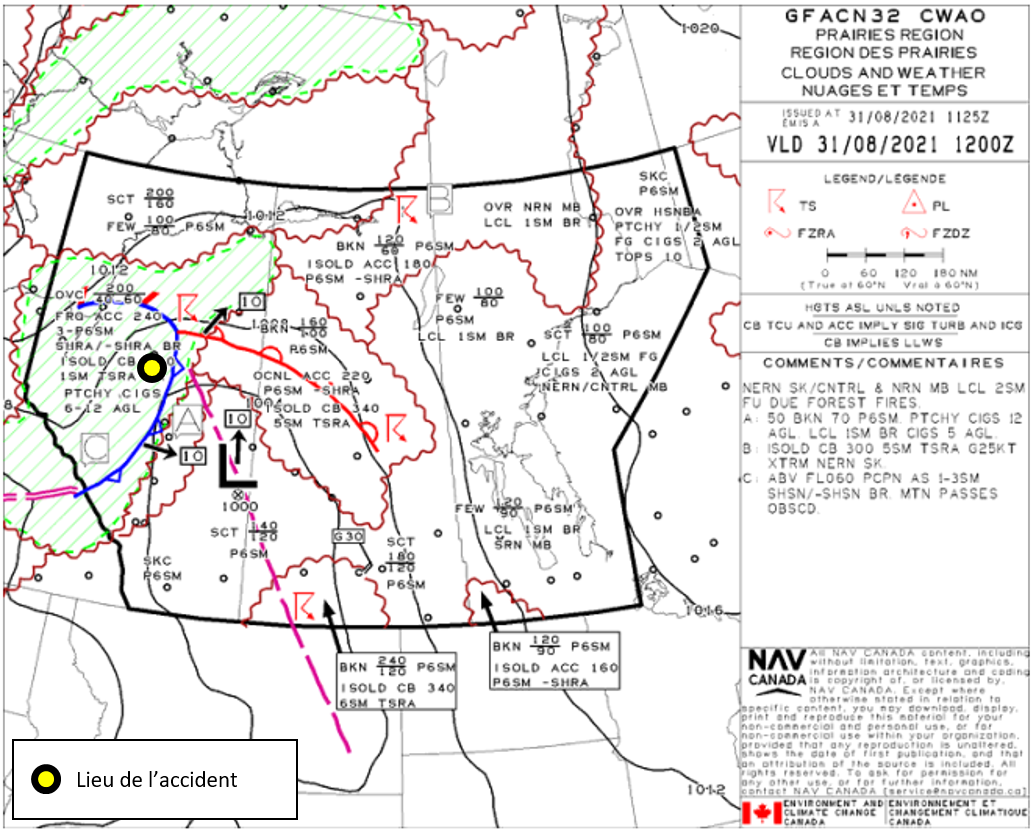 La GFA indiquait également des nuages cumulonimbus isolés avec des sommets à 34 000 pieds ASL, entraînant une visibilité de 1 SM dans des orages, de la pluie et de la brume. Durant ces périodes, un plafond de bancs de nuages était prévu entre 600 et 1200 pieds AGL.