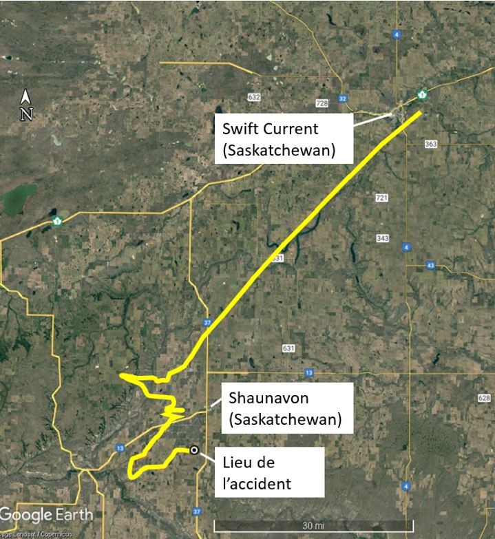 L’aéronef a décollé de CYYN à 8 h 27Note de bas de page 1 avec 2 pilotes à bordNote de bas de page 2. Vers 10 h 03, l’aéronef a heurté une tour de communication à environ 6 milles marins au sud-sud-ouest de Shaunavon (figure 1). La dernière position enregistrée de l’aéronef (à 10 h 01 min 30 s) selon son système de suivi des vols était à 1,2 mille marin à l’ouest-nord-ouest de la tour de communication à une altitude de 3741 pieds au-dessus du niveau de la mer (ASL), soit 572 pieds au-dessus du sol (AGL). L’aéronef a été détruit. Les 2 pilotes ont été mortellement blessés. La radiobalise de repérage d’urgence de 406 MHz de l’aéronef a été détruite au moment de l’impact, et aucun signal n’a été reçu par le système de recherche et de sauvetage par satellite.