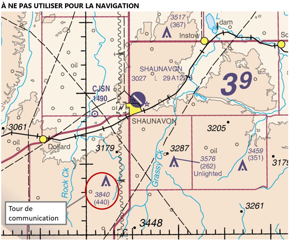 La hauteur de la tour de communication était de 3840 pieds ASL, ou 440 pieds AGL. Elle était balisée et éclairée conformément au Règlement de l’aviation canadienNote de bas de page 3. La tour était également représentée sur la carte de navigation VFR de Regina (figure 2). Une carte de navigation VFR est utilisée par les pilotes qui effectuent des vols VFR et illustre les obstacles et autres renseignements de navigation. L’enquête n’a pas permis de déterminer si les pilotes avaient consulté la carte lors de la planification du vol ou pendant le vol.