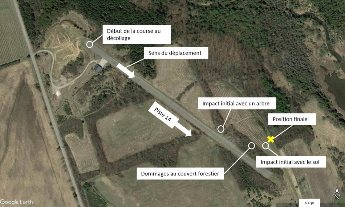 Des arbres matures sont présents des 2 côtés de la piste, à partir d’environ 600 pieds avant l’extrémité de départ de la piste 14. La zone herbeuse le long de la piste était entretenue jusqu’aux feux de bord de piste des 2 côtés de celle-ci. La piste n’avait pas été utilisée régulièrement depuis environ 5 ans. Un examen des images archivées de Google Earth et des conditions observées après l’événement montrent, qu’au cours des 4 dernières années, le couvert forestier s’est étendu vers les bords de la piste, réduisant probablement l’ouverture au-dessus de l’extrémité de départ de la piste 14. Le 14 septembre 2022, Transports Canada a été avisé par écrit que CTN7 était dorénavant fermé. Transports Canada a indiqué que CTN7 allait bientôt être retiré des publications.