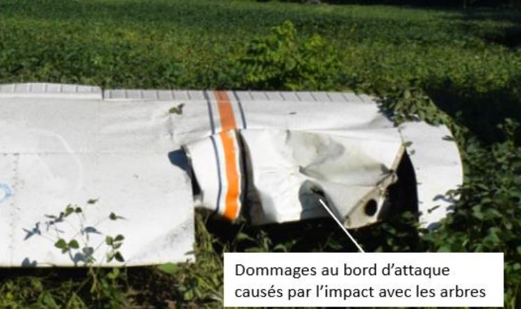 L’aéronef a percuté le sol en piqué quasi vertical; le nez et l’aile droite ont touché le sol en premier, suivis de la partie inférieure droite du fuselage. L’aile droite s’est presque séparée de l’aéronef et s’est repliée le long du côté droit du fuselage. Le moteur a été déplacé de manière significative à gauche de l’axe longitudinal du fuselage, et l’aile gauche a été relativement peu endommagée par l’impact au sol. Les bords d’attaque des 2 ailes présentaient des signes caractéristiques d’un impact avec les arbres, le plus important se trouvant sur le bord d’attaque extérieur de l’aile gauche, à environ 2 pieds de l’extrémité de l’aile (figure 2).