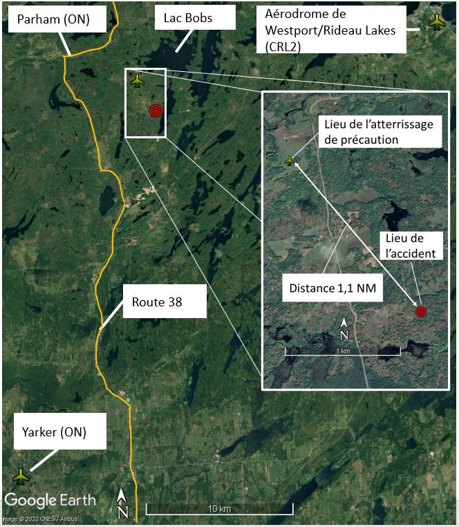 Des résidents du secteur ont appelé le 911 – une première fois à 15 h 16, et une seconde fois à 15 h 21, après quoi ils ont entamé des recherches pour retrouver l’aéronef. À 15 h 25, le Centre conjoint de coordination de sauvetage de Trenton (Ontario) a été informé de l’accident et a lancé une opération de recherche et sauvetage (SAR) dans le secteur (figure 1). À 16 h 35, un hélicoptère Griffon CH146 a localisé l’aéronef et 2 techniciens SAR ont été hélitreuillés sur le lieu de l’accident. Peu après, des pompiers locaux sont arrivés et ont aidé à récupérer le pilote.