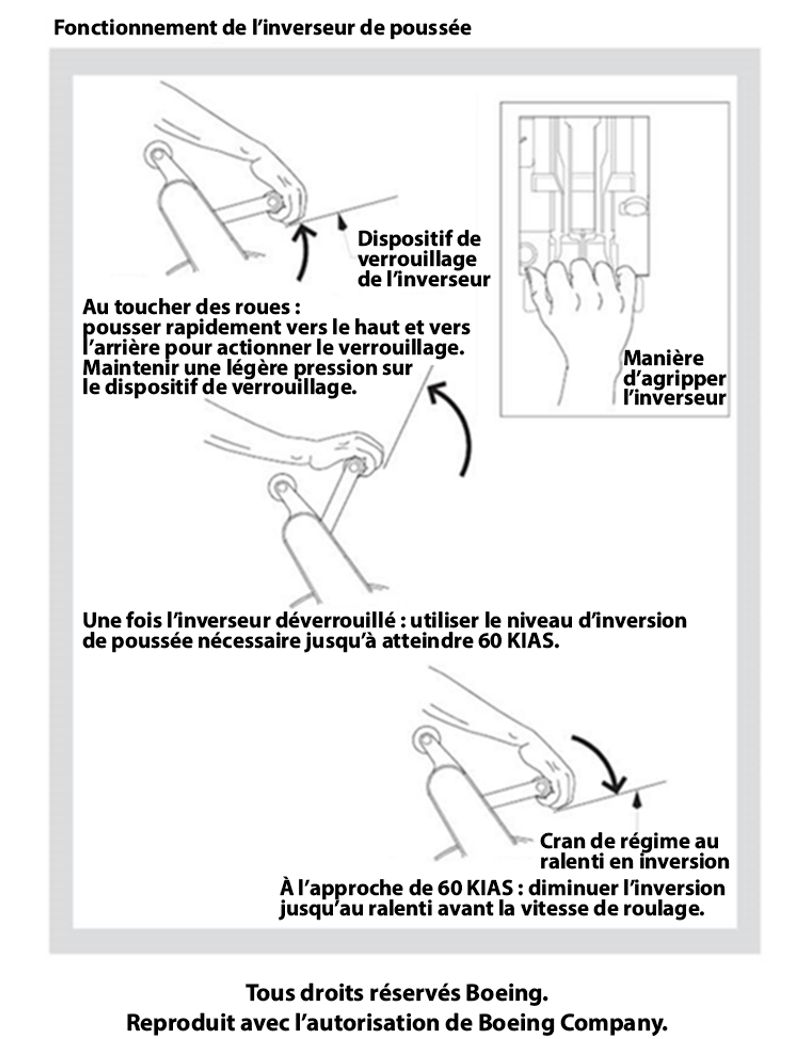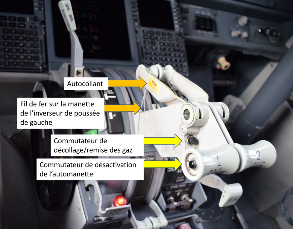 - La manette d’inversion de poussée gauche avait été verrouillée en position « fermé » conformément à la liste d’équipement minimal. Lorsqu’il a sélectionné la manette d’inversion de poussée droite après le toucher des roues, le pilote a retiré sa main des manettes de poussée, ce qui a permis à la manette gauche d’avancer, à l’insu de l’équipage, comme l’avait commandé l’automanette.