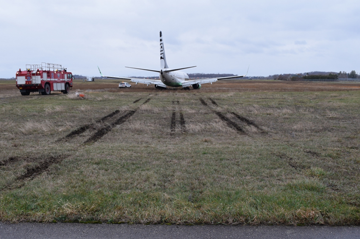 Le commandant de bord a immédiatement eu des difficultés avec la maîtrise directionnelle de l’aéronef et a amorcé un freinage manuel. Le commandant de bord a fermé l’inverseur de poussée no 2 et a pu garder l’aéronef sur la surface de la piste tout en serrant les freins manuels. Lorsque le commandant de bord a serré les freins au maximum, il restait environ 2500 pieds de piste, et l’aéronef roulait à une vitesse sol de 115 noeuds sans aérofreins, avec l’un des moteurs produisant une poussée quasi maximale et l’autre, une inversion de poussée près du maximum. À cette vitesse et dans cette configuration, il ne restait pas suffisamment de piste pour immobiliser l’aéronef, et ce dernier a dépassé l’extrémité de la piste à 6 h 25 HNE. L’aéronef a dépassé la surface pavée de la piste 26 à une vitesse sol de 45 noeuds, est entré dans une zone d’herbe meuble et s’est immobilisé à environ 300 pieds du bord du pavage et à 500 pieds de l’extrémité de la piste.