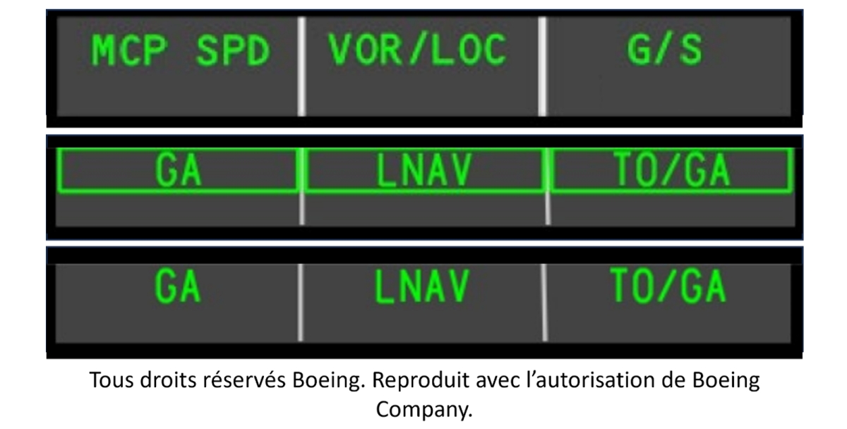 Le mode de remise des gaz peut seulement être sélectionné au moyen de l’un des commutateurs TO/GA qui se trouvent sur les manettes de poussée (voir la figure 1 dans la section 1.1 Déroulement du vol).
