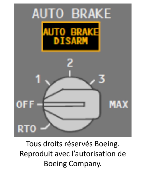 Le panneau de commande du freinage automatique contient un sélecteur rotatif qui peut être placé à RTO (décollage interrompu), OFF (éteint), 1, 2, 3 ou MAX. Le taux de décélération dépend de la position du sélecteur.