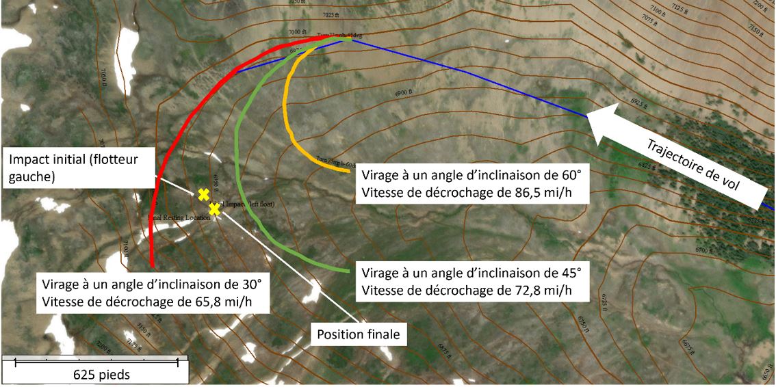 Lorsque l’aéronef a amorcé son virage, sa vitesse anémométrique est tombée en dessous de 80 mi/h, et le klaxon de l’avertisseur de décrochage a retenti. La pilote a mis la pleine puissance, mais l’aéronef est entré en collision avec le relief. Une analyse de la performance réalisée au cours de l’enquête a permis de déterminer qu’un virage à 45° d’inclinaison à 73,2 mi/h aurait dû être possible; cependant, on n’a pu déterminer ni la vitesse et l’angle d’inclinaison réels de l’aéronef, ni l’influence de possibles courants descendants dans la zone.