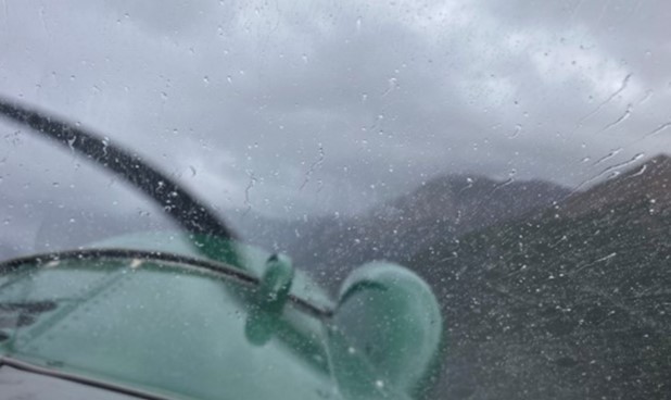 La pluie sur le pare-brise d’un aéronef peut masquer les repères extérieurs accessibles au pilote, ce qui rend la surveillance visuelle et la perception plus difficiles et plus longues. Les gouttelettes d’eau qui ruissellent sur le pare-brise d’un aéronef peuvent nuire à la visibilité vers l’avant, ce qui complique la tâche déjà complexe du pilote consistant à estimer la hauteur de l’aéronef au-dessus du sol et la distance par rapport aux nuages. La nécessité de traiter visuellement la contamination du pare-brise peut détourner les ressources cognitives du pilote des tâches cruciales que sont le pilotage de l’aéronef et la prise de décision pendant les manœuvres effectuées dans des zones restreintes, telles que les vallées.