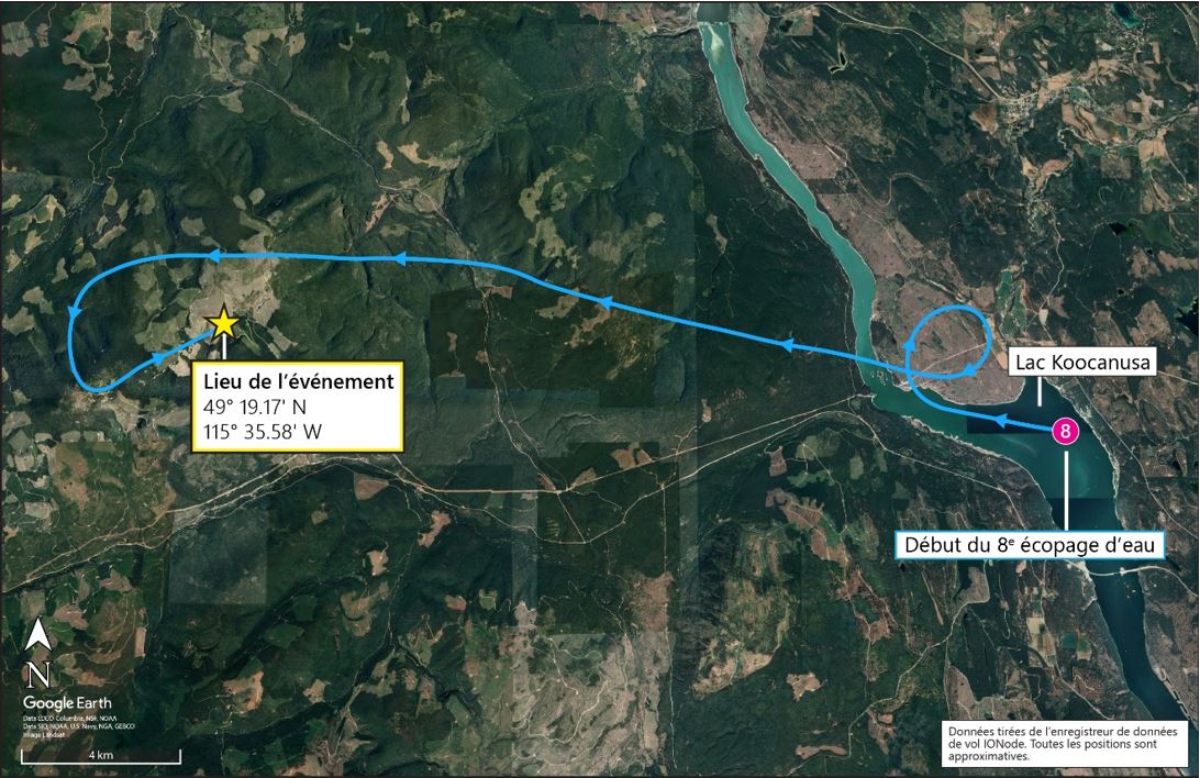 Après le chargement d’eau au lac Koocanusa, le Fireguard 673 est retourné à l’incendie de Connell Ridge pour le 8e largage d’eau. Une fois ce largage d’eau terminé, vers 19 h 37, le pilote a poussé la manette des gaz; la puissance du moteur a d’abord réagi en conséquence, mais elle est ensuite retombée de la même façon que lors de la réduction temporaire de puissance qui s’était produite après le 7e largage d’eau. Cependant, cette fois-ci, la puissance du moteur n’est pas revenue. L’aéronef se trouvait alors à environ 350 pieds au-dessus du sol (AGL).