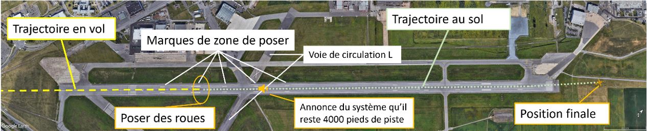 Une fois la piste en vue, l’équipage a poursuivi l’approche, et l’avion a maintenu une vitesse comprise entre 125 et 130 nœuds de 200 à 50 pieds au-dessus de l’altitude d’aérodrome. Lorsqu’il a survolé le seuil décalé de piste à une hauteur de 26 pieds à une vitesse de 126 nœuds, les 2 moteurs ont été mis au ralenti. L’avion s’est posé 6 secondes plus tard à une vitesse de 122 nœuds à 1100 pieds au-delà du seuil de piste décalé et dans le milieu de la zone de poser des roues. Selon la configuration de l’avion, la vitesse de référence d’atterrissage (VREF) visée à 50 pieds était de 121 nœuds, avec une vitesse de poser des roues égale à 95 % de cette VREF, soit 115 nœuds.