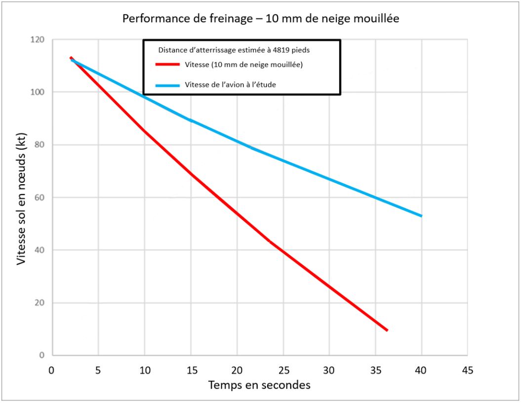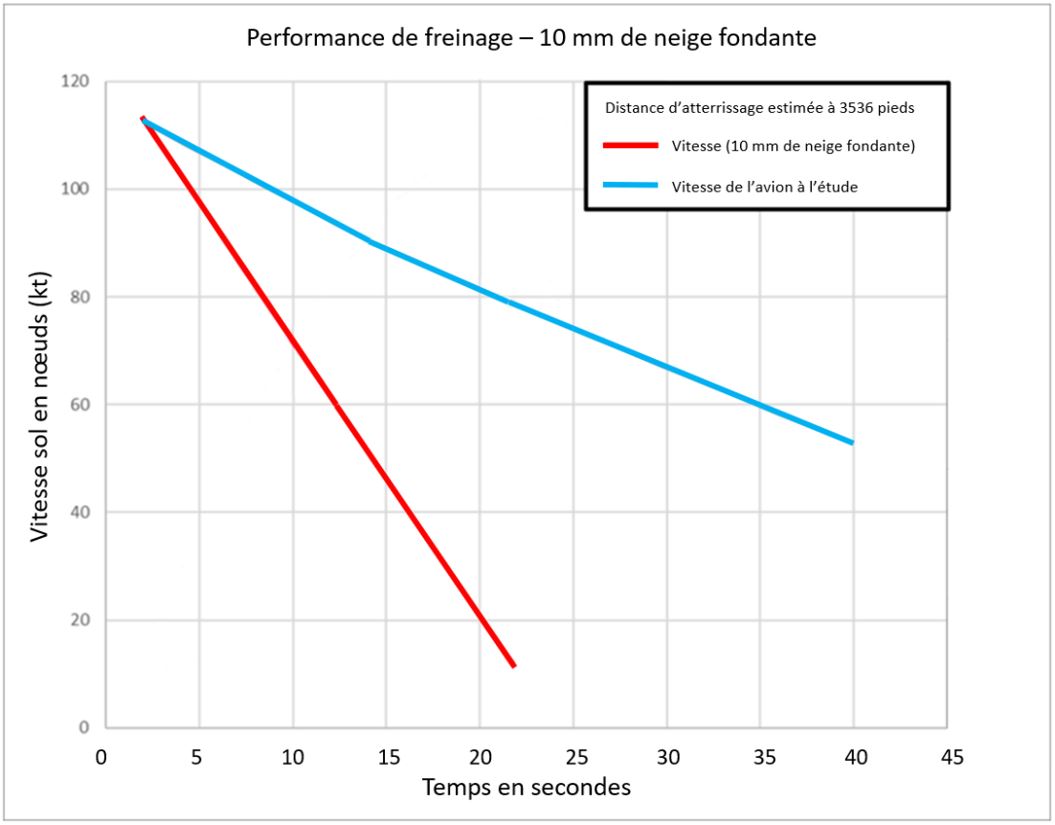 Comme les conditions météorologiques étaient changeantes, l’enquête s’est penchée sur la possibilité de conditions de surface de piste changeantes aussi. La décélération de l’avion à l’étude a été calculée pour différents types de contamination de piste et a été comparée à la décélération type de l’avion. La décélération lors de l’atterrissage du vol à l’étude était comparable à celle d’un avion HondaJet HA-420 atterrissant sur une piste contaminée à 100 % par de la glace.
