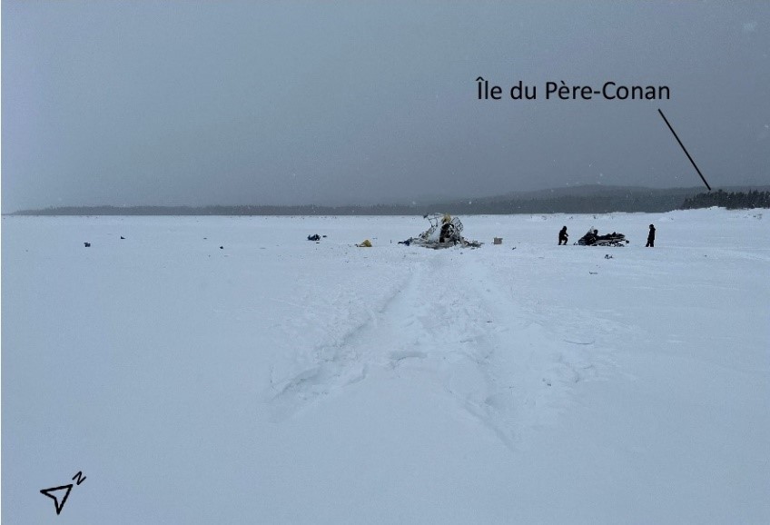 Lors de la descente, le pilote a aperçu l’île du Père-Conan située dans la baie et a décidé de manœuvrer pour aller atterrir près des arbres se trouvant sur l’île afin d’avoir un meilleur contraste visuel avec la surface enneigée.