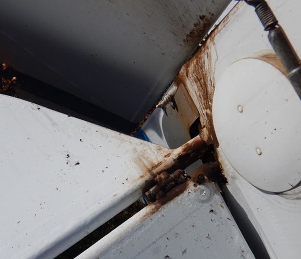 L’épave de l’hydravion reposait à l’envers. Les dommages aux flotteurs et au moteur étaient symétriques, signe d’un contact avec le sol dans des conditions de roulis nul. Un petit arbre a été sectionné par l’aile droite. La distance entre cet arbre et l’épave suggère un angle de piqué d’environ 60° au moment de l’impact avec le sol. Tout comme pour l’aile gauche, pratiquement tous les points d’attache, charnières et tringleries des commandes de vol de l’aile droite, ainsi que la queue de l’aéronef, présentaient d’importants signes de corrosion (figure 2).
