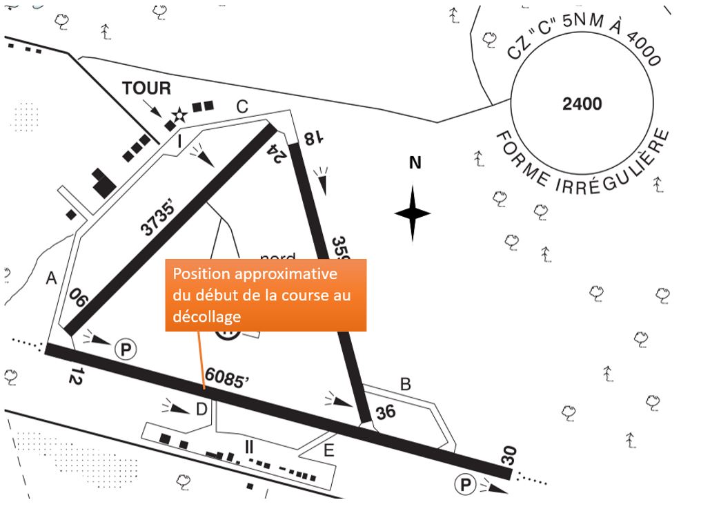 Après le démarrage et les vérifications avant vol, l’élève-pilote a appelé le contrôleur tour pour demander l’autorisation de circuler au sol et de décoller de la piste 30. Cependant, le contrôleur tour a donné à l’élève-pilote l’instruction d’attendre à l’écart de la piste 30 sur la voie de circulation A, car il y avait un retard en raison des nombreux aéronefs se trouvant dans le circuit. À 9 h 40, le contrôleur tour a donné l’instruction à l’élève-pilote de circuler à contresens sur la piste 30 à partir de la voie de circulation A. L’aéronef a circulé à contresens et a fait demi-tour juste avant la voie de circulation D. Le contrôleur tour l’a alors autorisée à décoller de cette position (figure 1).