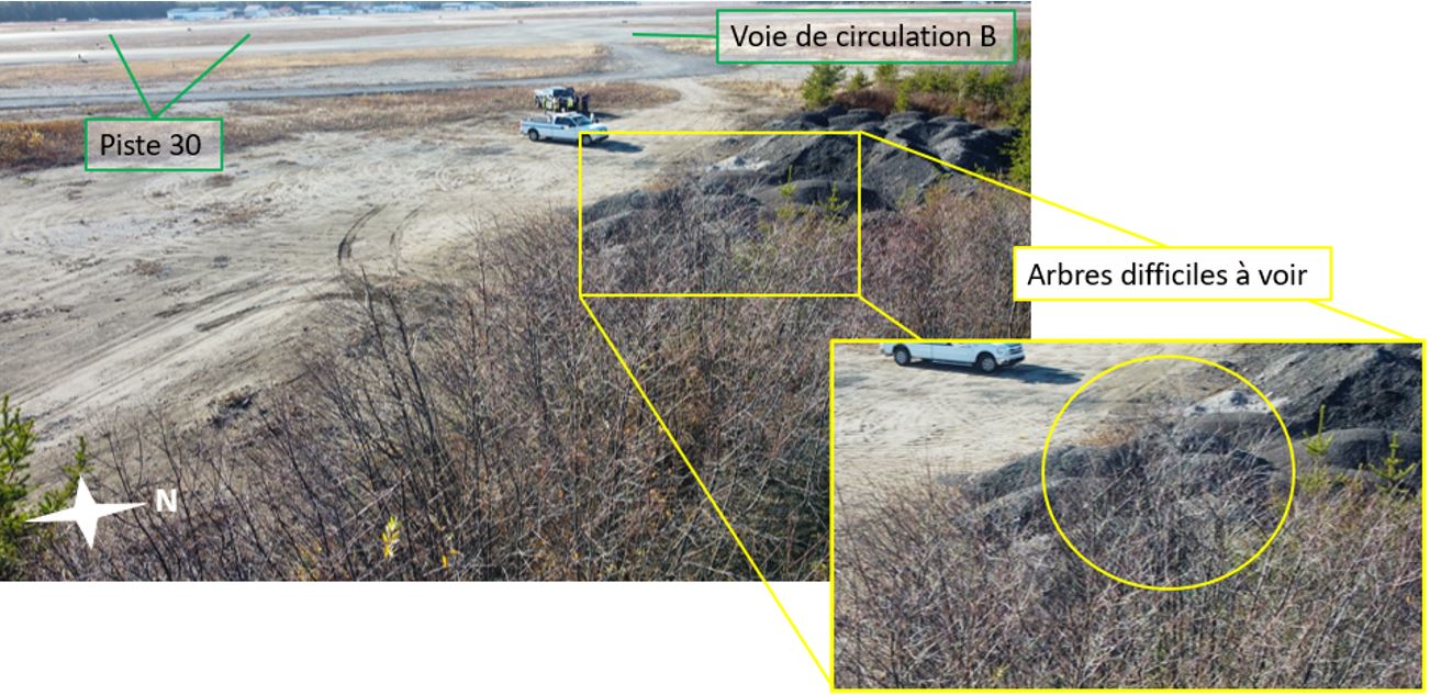 Les arbres que l’aéronef a percutés mesuraient environ 20 pieds de haut et avaient perdu leurs feuilles, ce qui les rendait difficiles à voir en raison du faible contraste avec la zone de gravier environnante (figure 4).