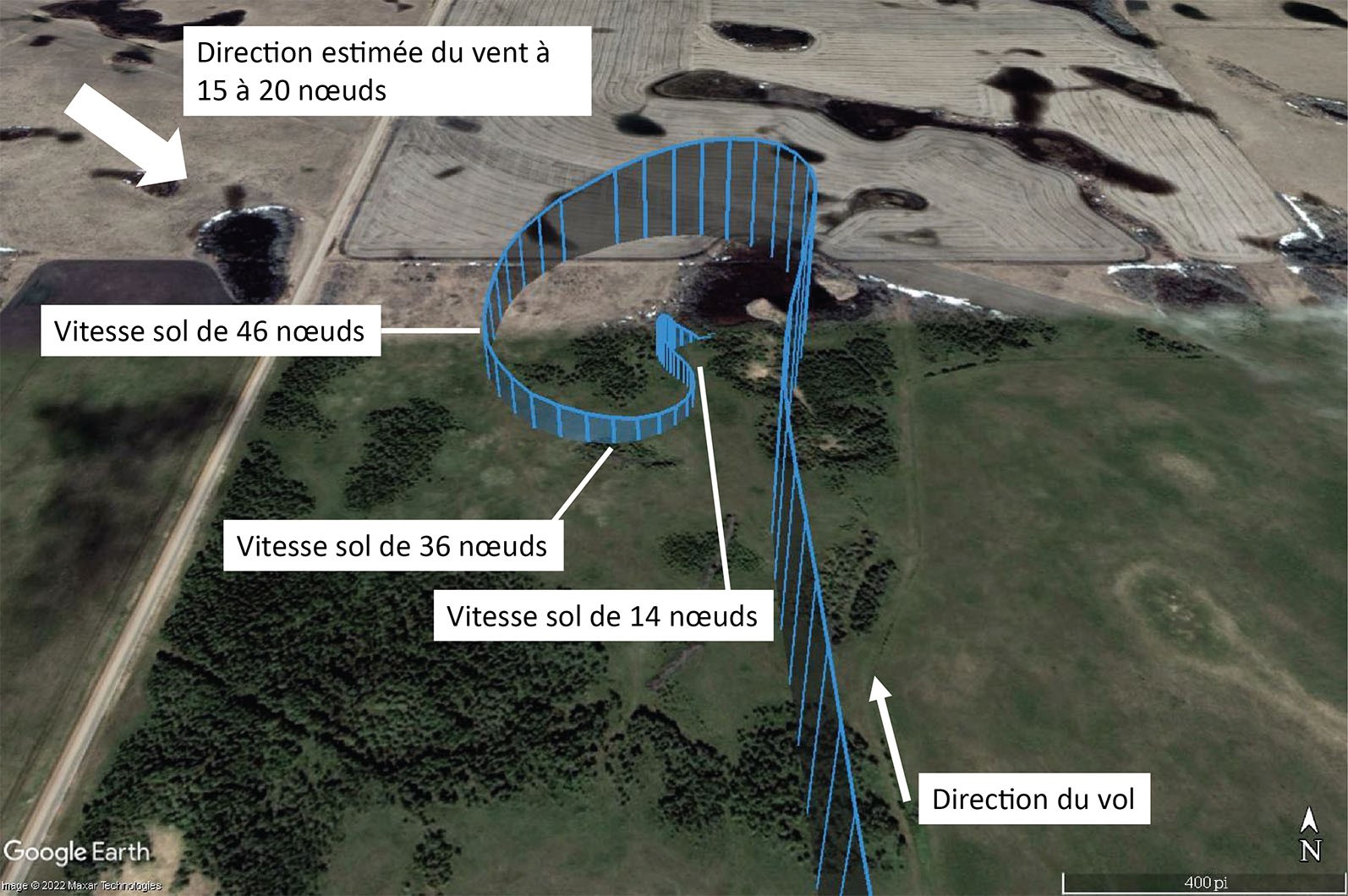 Après le départ, le pilote s’est dirigé vers le nord-est en direction de la ligne de relevé initiale vers le sud. Le relevé a commencé à 8 h 46 et s’est terminé à 9 h 20. Le pilote s’est ensuite rendu 2,5 milles marins (NM) à l’est, vers la ligne de relevé suivante. Le relevé a été effectué en direction nord et a commencé à 9 h 22. Au cours du relevé en direction nord, plusieurs manœuvres de vol à basse altitude et à faible vitesse ont été effectuées afin que les observateurs puissent relever la faune qu’ils avaient repérée. Vers 9 h 46, les observateurs ont repéré plusieurs animaux dans des broussailles, et le pilote a effectué un virage à gauche de 360° en descente et en décélération pour permettre aux observateurs de dénombrer et de classifier les animaux. Après avoir effectué le virage à gauche, l’hélicoptère était sur une trajectoire de 330° magnétiques (M) à une altitude d’environ 2400 pieds ASL (80 pieds AGL) et à une vitesse sol d’environ 9 nœuds. À ce moment-là, l’hélicoptère a amorcé une rotation intempestive vers la droite (figure 1).